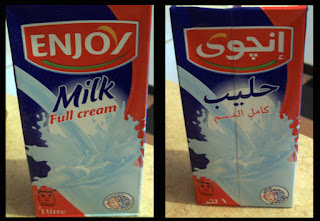 Here we have our milk carton. They come in the cartons like juice boxes or soy milk or vegetable/chicken/beef stock. Kind of different than what I'm used to. English on the left, Arabic on the right. And yeah, hubby likes full milk. Thankfully I only use it in cooking, because who can drink that?? Well, aside from hubby that is. lol Actually I think it's quite common here to drink full milk.